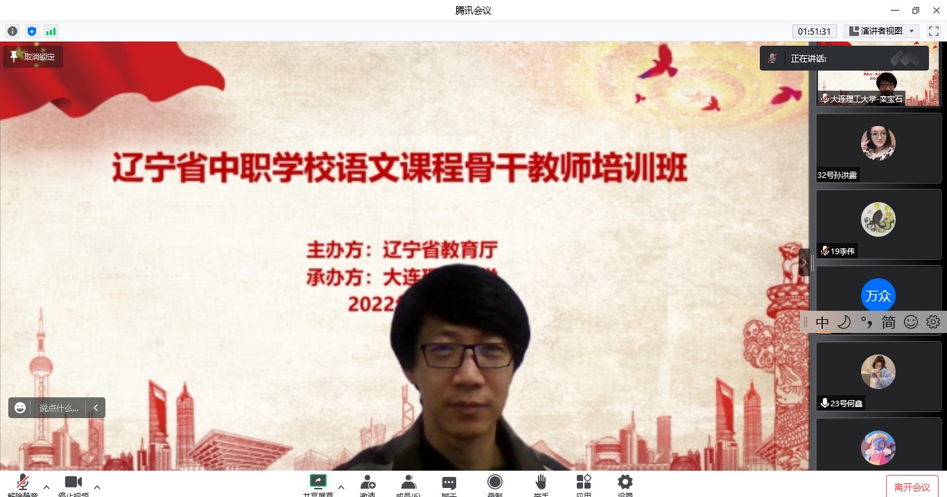 10月10日,2022年辽宁省职业院校教师素质提高计划:中职学校语文课程骨干教师培训班(三期)在我校开班,来自全省32名中职学校语文课程骨干教师齐聚云端,开启第一阶段线上课程的学习之旅。